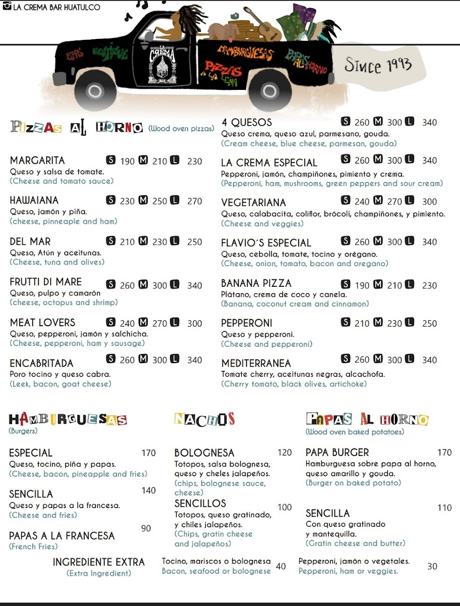 Guests can expect a variety of pizzas, like the signature Pizza la Crema or the distinctive Pizza de Plátano, served fresh from the wood-fired oven. Complementing the dishes are snacks such as Nachos A la Boloñesa and Papas Rellenas—perfect for sharing or enjoying with friends over drinks.